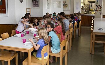 Das Küchenteam um Frau Denninger bringt abwechslungsreiche und leckere Kost auf den Teller, auf Wunsch gerne auch vegetarische Gerichte. An den Tischen unseres großen Speisesaals finden bis zu 70 Hungrige ihren Platz. Mit reichhaltigem Frühstück, Mittag- und Abendessen kommt jeder gut durch den Tag. Tischdienste unterstützen das Küchenteam. So gibt es keine langen Wartezeiten.